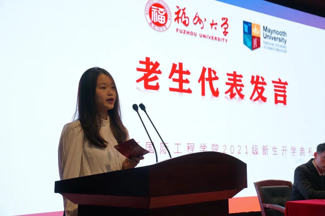 接着,老生代表谢思妍与2021级新生代表李冠东相继上台以英文发言,从自身感悟出发,阐述了有关生活、校园、学业各方面的认知,立志拓宽视野、全面发展。