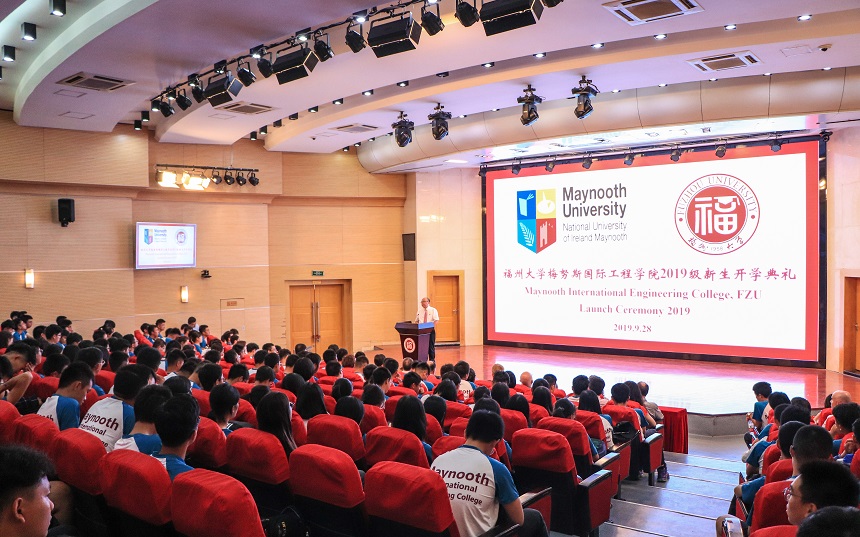 副校长兼学院院长王健,学院外方副院长Ronan·Reilly(罗南·雷利),电气工程与自动化学院何希耕书记、物理与信息工程学院张红书记、数学与计算机科学学院郭文忠院长应邀出席;全体嘉宾与2019级新生及中外方行政人员、中方专业负责人、外方教师齐聚一堂,共同见证学院历史时刻。