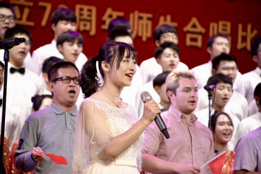 2019级新生和十余名中外教师组成的合唱团以一曲脍炙人口的《我和我的祖国》和经外籍教师原创改编的英文歌曲《祝中国生日快乐》,共同祝福祖国、献礼中国!并最终取得“优胜奖”的可喜成绩!