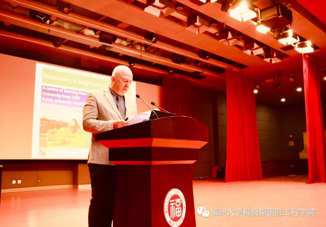 梅努斯国际学院的诞生表示荣幸,认为学院的未来发展不可限量。他向全体家长介绍了爱尔兰的国情,强调其在IT科技领域取得的卓越成绩,认为这与学院所开设专业高度契合,将为学生提供大量优质的实习机会与绝佳的就业前景。并从历史沿革、国际声誉、质量保障、交流及深造渠道、师资力量等方面全面展示了爱尔兰国立梅努斯大学所拥有的不俗实力,相信学院将为学生提供独特的教育体验,培养他们具备融入未来经济社会所需的批判性思维和专业能力。