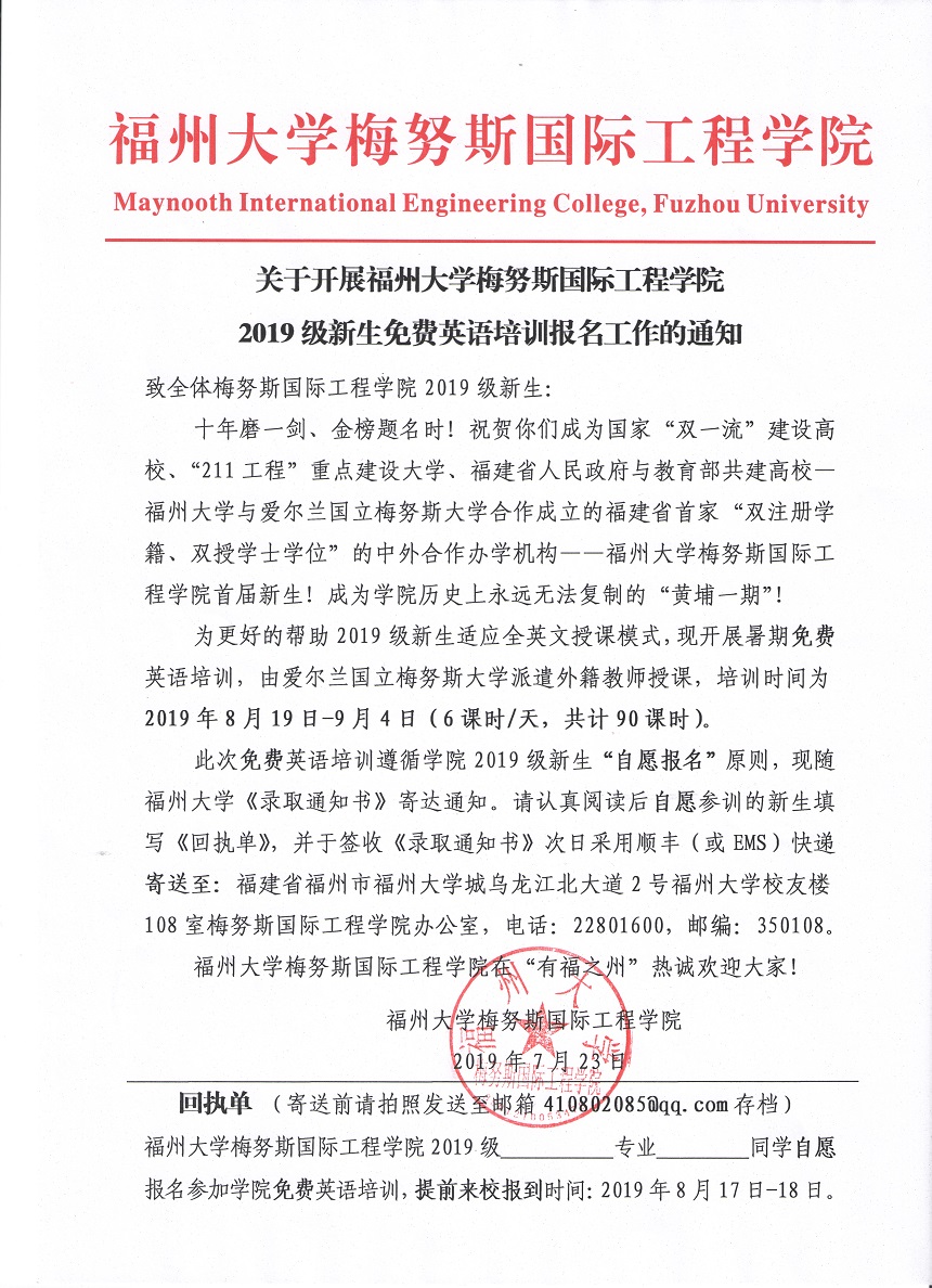 为帮助大家适应全英文授课模式,现学院决定开展免费英语培训,时间为2019年8月19日-9月4日(6课时/天,90课时),遵循“自愿报名”原则。大家收到的中文无码 《录取通知书》中将会随寄培训报名通知,请自愿报名新生按要求将《回执单》寄回。通知详见下图: